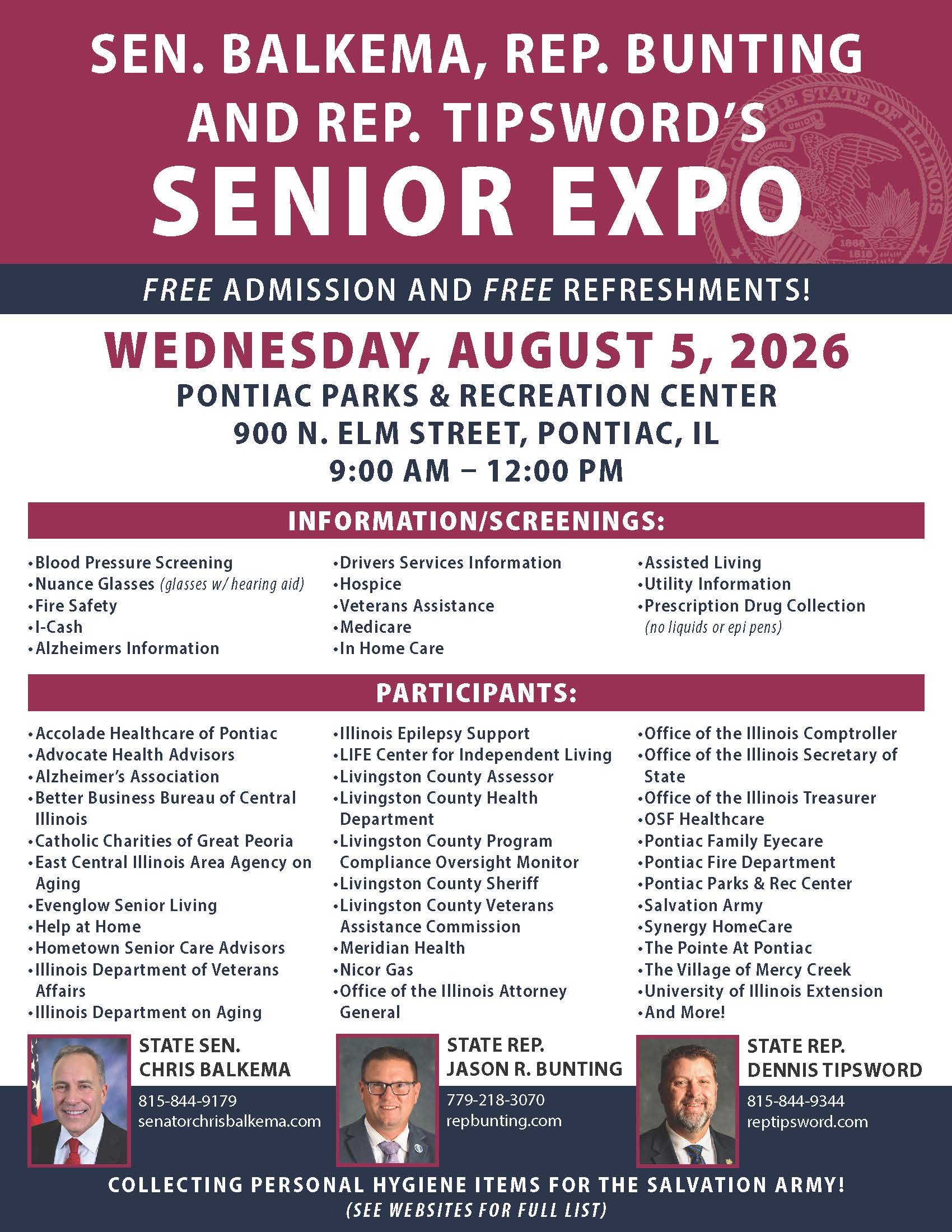Mark your calendar! Senator Chris Balkema, Representative Dennis Tipsword and I will be hosting a FREE senior expo in Pontiac on Wednesday August 5. We will be at the Pontiac…